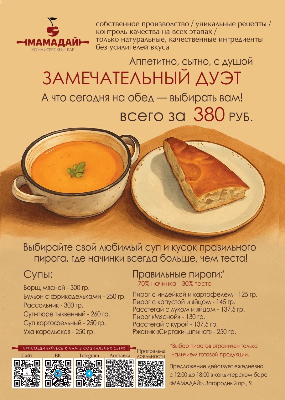 Для вас наше новое специальное предложение «Суп + кусок правильного пирога 70% начинка, 30% тесто» за 380 рублей – это отличный способ вкусно и недорого пообедать, зарядиться энергией и поднять себе настроение. Насыщенный и вкусный суп в сочетании с ароматным пирогом с щедрой начинкой - идеальная гастрономическая пара, которую вы создадите сами. Приходите к нам и убедитесь сами!