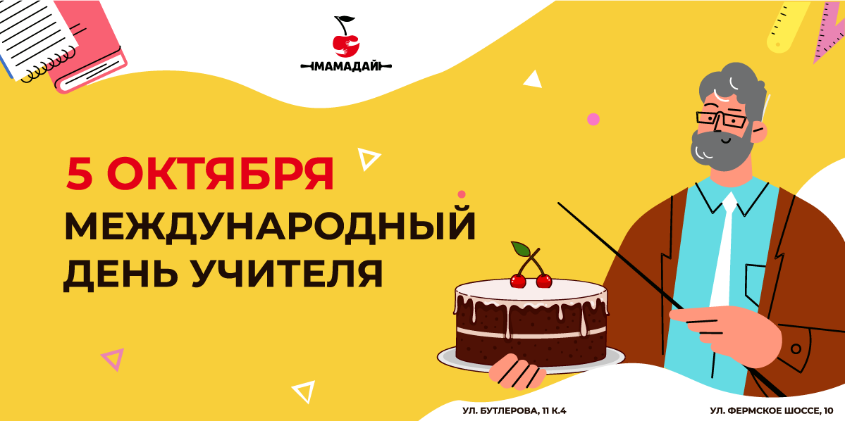 Пекарни-кондитерские "МАМАДАЙ" специально к этому празднику подготовили лимитированную серию тортов, которые помогут приятно удивить вашего любимого учителя. Приобрести торты можно с 3 октября по адресам: ул. Бутлерова д. 11 к.4 и Фермское шоссе д. 10.